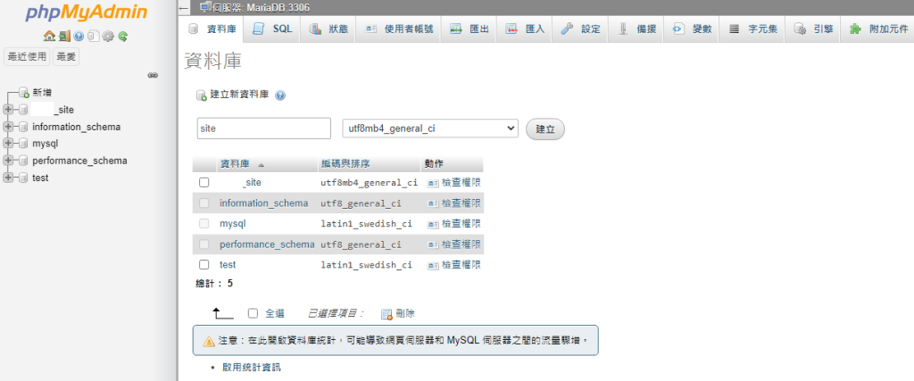 第五步 於WEB主機登入phpMyAdmin,並新增一個資料庫site。
